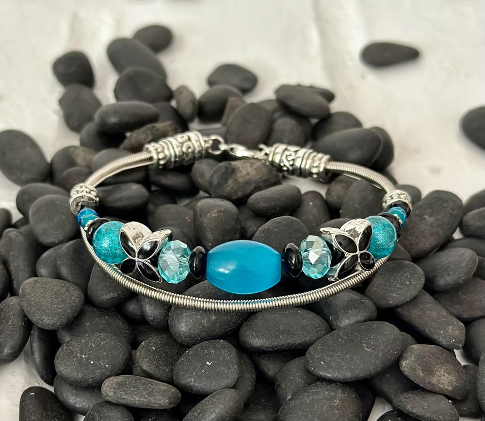 This hand crafted piece is made from strings used by Scott Wilson during the Fire music video shoot. Inspired by "Fire" with Turquoise blue cats eye + oval glass beads with crystals. Along with black pedal findings and shimmer bead accents.